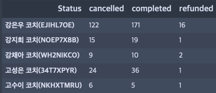 코치별 담당 사용자(total) / 구매 완료 횟수(completed) / 캔슬 횟수(canceled) / 환불 횟수(refunded)를 구해보겠습니다.