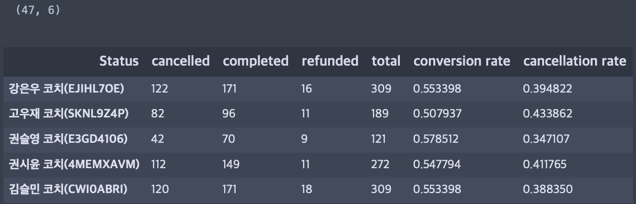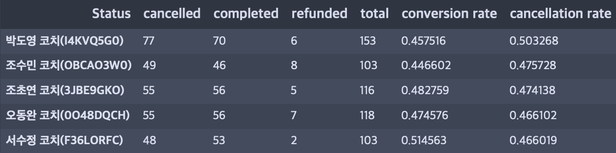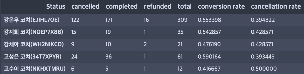 코치별 전환율(conversion rate) / 취소율(cancellation rate)를 계산해 보겠습니다.