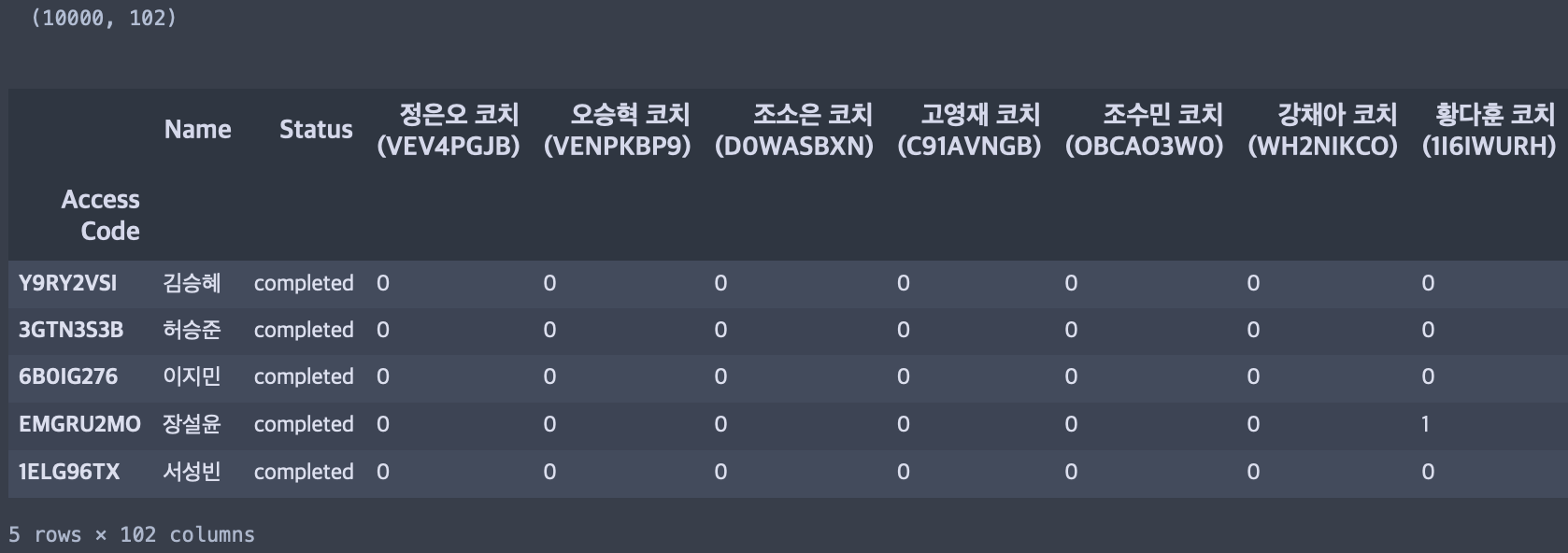 여기서 인덱스(index)는 눔 코치 사용자들의 아이디(Access Code), 열(column)은 코치들의 이름과 아이디(Access Code)입니다. 값은 코치가 사용자에게 코칭을 한 횟수를 나타냅니다. (한 명의 사용자가 여러 명의 코치에게 코칭을 받는 것도 가능합니다)